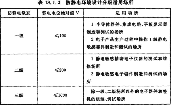 13.1.2 防靜電環(huán)境設計應按電子產(chǎn)品或生產(chǎn)工序(設備)進行分級。防靜電環(huán)境內(nèi)靜電電位絕對值應小于電子產(chǎn)品的靜電電位安全值。防靜電環(huán)境設計應分為三級,防靜電環(huán)境設計分級適用場所應符合表13.1.2的要求。