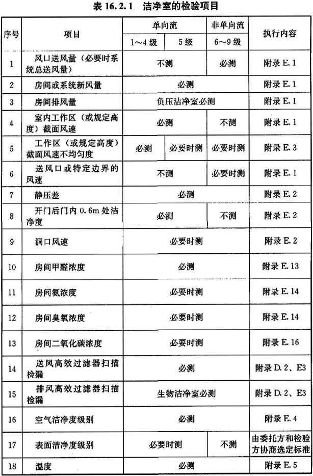 16.2.1 潔凈室在高效過濾器現(xiàn)場檢漏后的必測項(xiàng)目,應(yīng)符合表16.2.1的要求,也可由該表選擇選測項(xiàng)目。