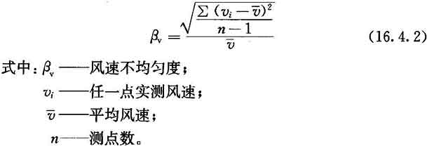 16.4.2 當(dāng)需對室內(nèi)單向流品質(zhì)作細(xì)致確認(rèn)時(shí),可測工作區(qū)(或規(guī)定高度)截面風(fēng)速不均勻度。風(fēng)速不均勻度應(yīng)按附錄E檢驗(yàn),并按下式計(jì)算,結(jié)果不應(yīng)大于0.25。