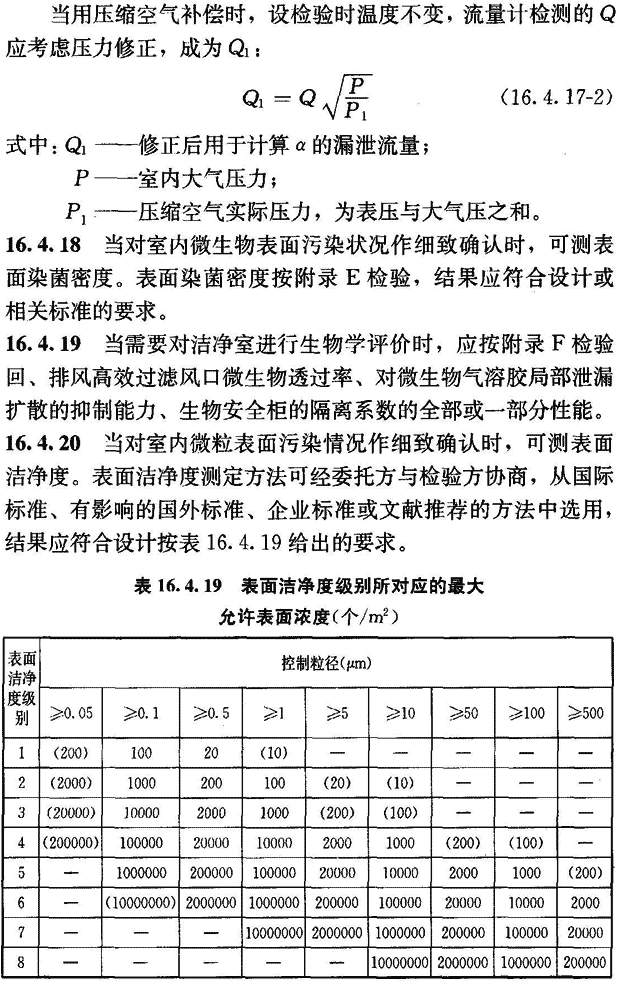 16.4.17 當(dāng)對潔凈室的嚴(yán)密性有特殊要求時(shí),可測其圍護(hù)結(jié)構(gòu)嚴(yán)密性。圍護(hù)結(jié)構(gòu)嚴(yán)密性按附錄G檢驗(yàn)。檢驗(yàn)結(jié)果應(yīng)符合設(shè)計(jì)要求。當(dāng)設(shè)計(jì)無明確要求時(shí),可在以下兩表的任何一種評定方法中任選一種方法,兩表中最大測試壓力設(shè)定為500Pa。