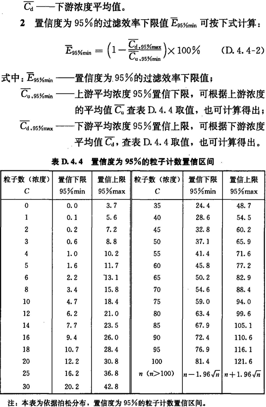1 首先應(yīng)測試過濾器上游氣溶膠濃度Cu,并應(yīng)根據(jù)表D.4.4計(jì)算上游95%置信下限的粒子濃度Cu,95%min。