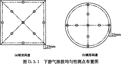 2 可在過濾器下游(或混勻裝置下游)適當(dāng)距離處,選擇一斷面,在該斷面上至少布置9個(gè)采樣管,采樣管為開口迎向氣流流動(dòng)方向的剛性金屬管,管徑應(yīng)盡量符合常規(guī)采樣儀器的等動(dòng)力采樣要求,其中5個(gè)采樣管在中心和對(duì)角線上均勻布置,4個(gè)采樣管分別布置于矩形風(fēng)道各邊中心、距風(fēng)道壁面25mm處(圖D.3.1a)。圓形風(fēng)道采樣管布置采用類似原則進(jìn)行(圖D.3.1b)。應(yīng)在氣溶膠發(fā)生器穩(wěn)定工作后(此時(shí)被測過濾器上游氣溶膠濃度至少應(yīng)為進(jìn)行效率測試試驗(yàn)時(shí)下限濃度的2倍以上),對(duì)每個(gè)測點(diǎn)依次進(jìn)行至少連續(xù)3次采樣,每次采樣時(shí)間不應(yīng)少于1min,并取其平均值作為該點(diǎn)的氣溶膠濃度檢測結(jié)果。當(dāng)所有9個(gè)測點(diǎn)的氣溶膠濃度測試結(jié)果與各測點(diǎn)測試結(jié)果算術(shù)平均值偏差均小于±20%時(shí),可認(rèn)為過濾器下游氣溶膠濃度均勻性滿足測試需要。