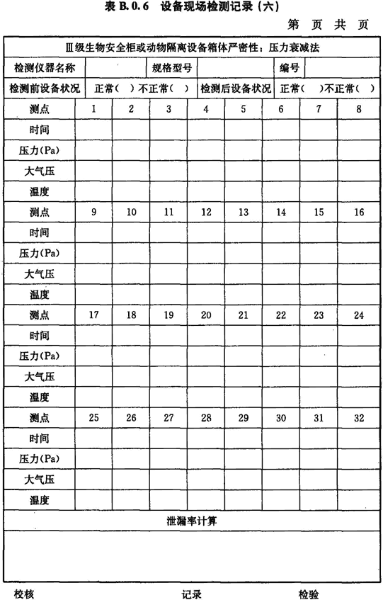 B.0.6 Ⅲ級生物安全柜或動物隔離設(shè)備箱體密封性的檢測應(yīng)按表B.0.6進(jìn)行記錄。