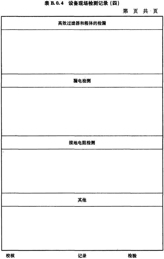 B.0.4 排風(fēng)高效過濾器的檢漏、生物安全柜箱體的檢漏、生物安全柜漏電檢測、接地電阻檢測等的檢測應(yīng)按表B.0.4進(jìn)行記錄。