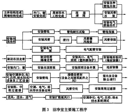 9.1.1 三級和四級生物安全實驗室是有負壓要求的潔凈室,除了在結(jié)構(gòu)上要比一般潔凈室更堅固、更嚴密外,在施工方面,其他要求與空調(diào)凈化工程是基本一致的,為達到安全防護的要求,施工時一定要嚴格按照潔凈室施工程序進行,潔凈室主要施工程序參考圖3。