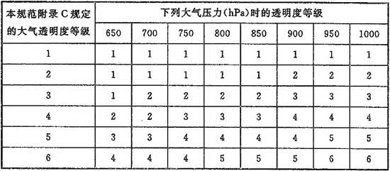 4.3.4 采用本規(guī)范附錄C和附錄D時,當?shù)氐拇髿馔该鞫鹊燃墤鶕?jù)本規(guī)范附錄E及夏季大氣壓力按表4.3.4確定。