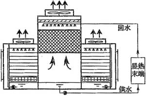 通常情況下,當室外空氣的露點溫度低于14℃~15℃時,采用間接—直接蒸發(fā)冷卻方式,可以得到接近16℃的空調冷水作為空調系統(tǒng)的冷源。直接蒸發(fā)冷卻式系統(tǒng)包括水冷式蒸發(fā)冷卻、冷卻塔冷卻、蒸發(fā)式冷凝等。在西北部地區(qū)等于燥氣候區(qū),可通過蒸發(fā)冷卻方式直接提供用于空調系統(tǒng)的冷水,減少人工制冷的能耗,符合條件的地區(qū)推薦優(yōu)先推廣采用。