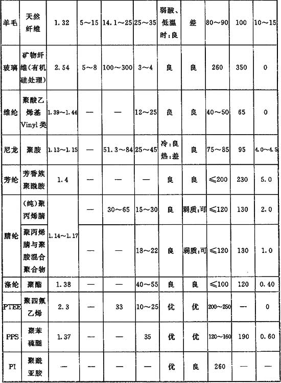 濾料性能應(yīng)滿足生產(chǎn)條件和除塵工藝的要求,濾料的主要性能包括耐溫性能、耐酸堿性能等,選擇濾料應(yīng)對(duì)各種因素進(jìn)行對(duì)比,抓住主要影響因素選擇濾料。應(yīng)盡可能選擇使用壽命長(zhǎng)的濾料。表面過(guò)濾方式已被公認(rèn)為有助于提高除塵效率,濾料表面覆膜可實(shí)現(xiàn)濾袋表面過(guò)濾,常用的覆膜材料如聚四氟乙烯(PTFE)。選用覆膜濾料會(huì)增加造價(jià),因此宜在技術(shù)經(jīng)濟(jì)條件合理時(shí)選用。常用濾料的物性指標(biāo)總結(jié)在表4中。