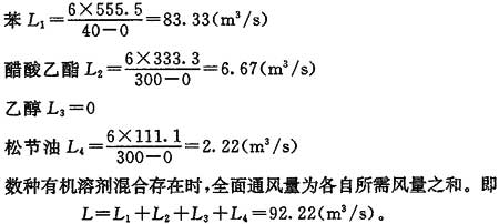 算例:某車間使用脫漆劑,每小時消耗量為4kg。脫漆劑成分為苯50%,醋酸乙酯30%,乙醇10%,松節(jié)油10%,求全面通風所需的空氣量。