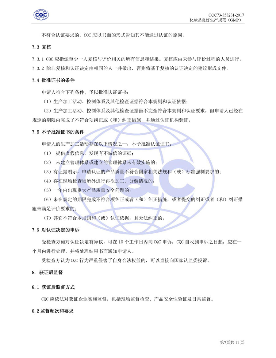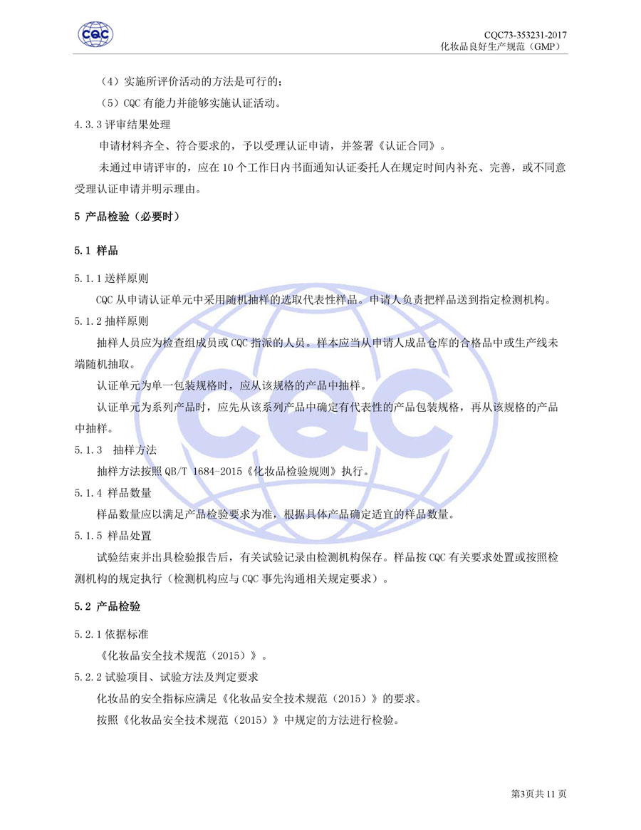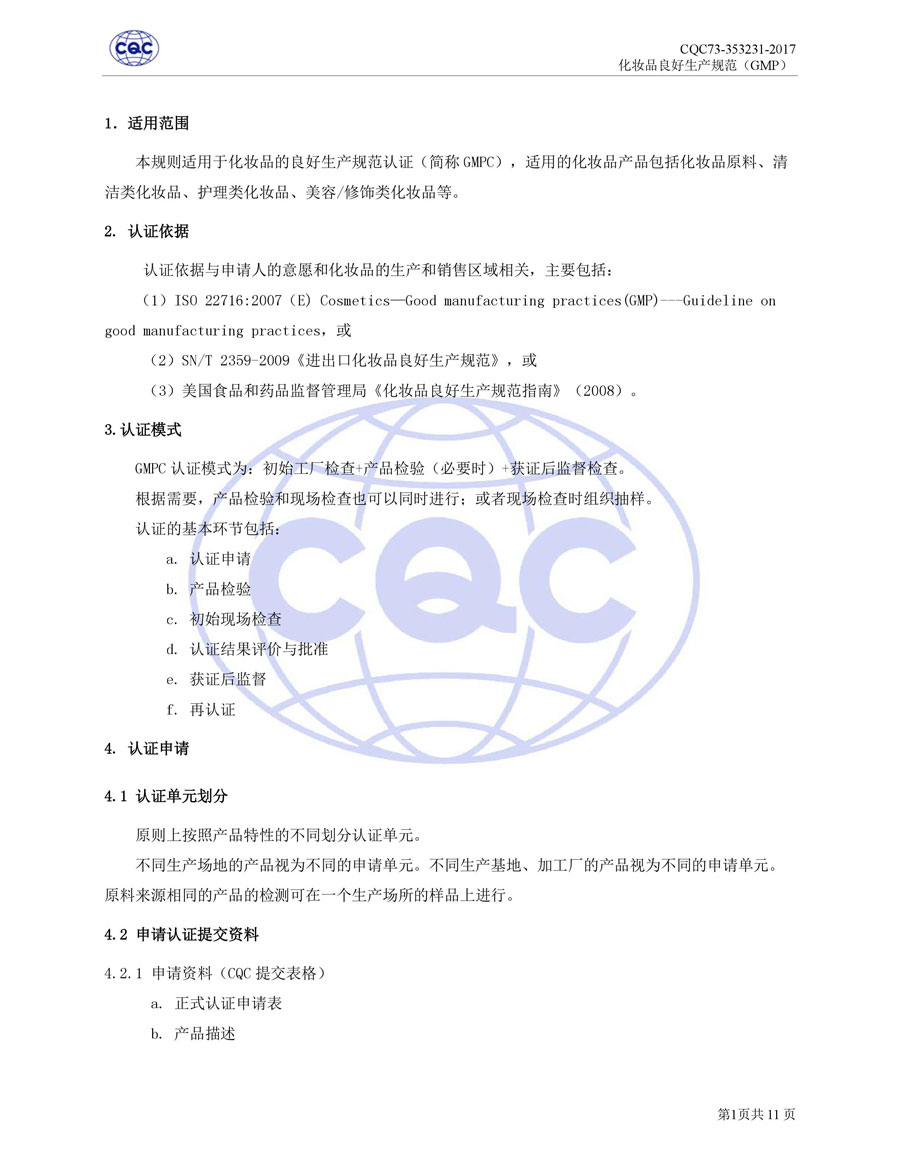 認(rèn)證依據(jù)為美國(guó)農(nóng)業(yè)部《Cosmetic Good Manufacturing Practice Guideline》, European Federation for Cosmetic Ingredients (EFfIC)-GMP for cosmetic ingredient,ISO 22716-2007《化妝品良好生產(chǎn)規(guī)范》、CQC73-353231-2016《化妝品認(rèn)證實(shí)施規(guī)則》及適用的法律法規(guī)等。
